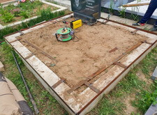 Изначально на участке находится лишь гранитный памятник прямоугольной формы и бетонный цоколь, который, по сути, бесполезен. Он не держит ограждение, не является фундаментом. Наша задача заключалась в следующем: уложить на данном объекте гранитную брусчатку.