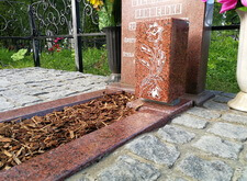 Цветник укрыли корой, у подножья надгробья поставили прямоугольную вазу с гравировкой. На фотографиях крупным планом видно, что новые гранитные элементы, изготовленные нами, немного ярче памятника. Это произошло из-за достаточно большого отрезка времени, которое прошло с момента установки надгробья. Полировка с него немного стёрлась, тогда как установленные нами дополнения были изготовлены совсем недавно.